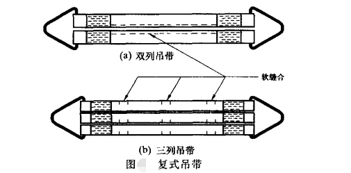 ③復式吊帶:由兩條或多條寬度相同并排放置的帶子構(gòu)成的吊帶。兒條帶子共有一個末端件,各條帶子的邊緣相互連接。