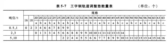 2、根據選用工字鋼型號規格的不同,調整電動小車的墊圈數量,要保證兩側輪緣與工字鋼間要有3-5mm的間隙。工字鋼軌道調整墊數量見表5-7.