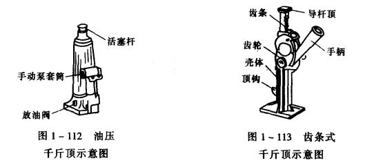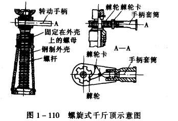棘輪手柄由棘輪、棘輪卡、手柄套筒組成。還有一種傘齒輪式螺旋千斤頂,如圖1-111所示。扳動操作手柄,經過傘形齒輪傳動,將千斤頂升起,這種千斤頂上還裝有一個換向扳鈕,可控制千斤頂的升和將。螺旋前幾單均有自鎖作用,所以重物不會因停止操作而突然下降,也無漏油等故障問題,維護保養也較方便,能在垂直、橫臥或倒放等幾種位置狀況下使用。使用的有5、10、15、30、50t等規格。手柄操作力有十多公斤到幾十公斤不等,由1-3人操作。