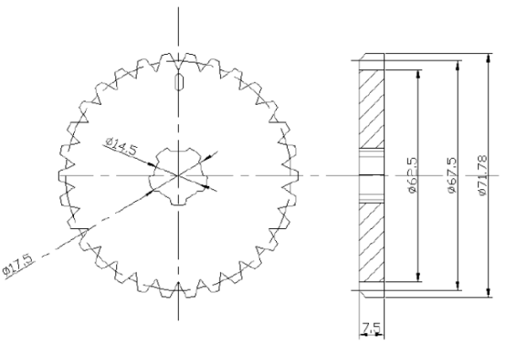 根據葫蘆傳動齒輪低速重載,根據手拉葫蘆傳動結構的原理由五尺長軸的小齒輪帶動片齒輪甲、乙,考慮到五尺長軸的小齒輪齒數甚小等特點,1.5型葫蘆選用了齒形角20°的漸開線特種片齒輪變位齒輪,其基本齒形的基本參數如圖所示。選用齒形是考慮了以下因素:1.5t葫蘆傳動齒輪的小齒輪齒數甚少為了避免根切和增強度,只能用正變位切削這樣小齒輪的外圓就受齒條的正切力,片齒輪與短軸屬于過硬配合,片齒輪的中心要設計出與短軸尺寸屬于硬配合的小花鍵孔尺寸如圖所示: