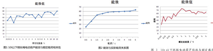 在對不同規格,不同型號的環鏈電動葫蘆的能效值進行對比的同時,還收集了同1臺葫蘆在從輕載到額載工況下,能效隨試驗載荷變化而變化的試驗數據。經過對數據的分析,圖2列舉了一臺5t的雙速環鏈電動葫蘆能效隨載荷變化的變化曲線,此曲線具有廣泛代表性。根據曲線趨勢,可得出以下結論,鋼絲繩電動葫蘆在吊載不足30%額定起重量的載荷時,其能效值很低,大量能量均被浪費,當吊載重物超過30%額定起重量的載荷時,電動葫蘆的能效值會有顯著提升,并逐漸趨于高能效值,直至吊載重物超過50%額定起重量,能效值變化非常微小,趨于穩定。