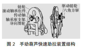 手拉葫蘆快速助拉裝置可以固定手拉葫蘆的手拉鏈條,給手拉鏈條提供拉力以提升重物,驅動力可通過鏈輪外接電機,也 可以通過內六角接頭外接氣動扳手。 該裝置由鏈輪、滾動軸承組件、傳動軸、軸承座支架、導向滑輪、驅動鏈輪和外六角方驅組成(圖 2)。