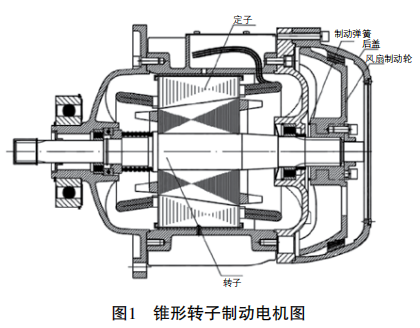 錐形轉(zhuǎn)子制動電機其定子內(nèi)腔和轉(zhuǎn)子外形均為圓錐形,轉(zhuǎn)子的每一個矽鋼片直徑都不相同,制動彈簧只有一根,制動輪和摩擦片均為環(huán)狀的圓錐面結(jié)構(gòu)。