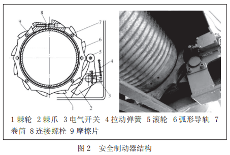 超速保護(hù)裝置中提到了安全制動(dòng)器,其結(jié)構(gòu)型式見圖2。標(biāo)準(zhǔn)規(guī)定當(dāng)起重機(jī)額定起重量大于5t時(shí),電動(dòng)葫蘆除設(shè)置一個(gè)工作制動(dòng)器外,還應(yīng)設(shè)置安全制動(dòng)器,且設(shè)置在電動(dòng)葫蘆的低速級上(當(dāng)起重機(jī)額定起重量小于或等于5t時(shí),也宜在低速級上設(shè)置安全制動(dòng)器,否則電動(dòng)葫蘆應(yīng)按1.5倍額定起重量設(shè)計(jì)),并要求在正常作業(yè)時(shí),安全制動(dòng)器應(yīng)在高速軸制動(dòng)器閉合后延時(shí)閉合,其延時(shí)動(dòng)作時(shí)間可調(diào),進(jìn)行緊急制動(dòng)時(shí),安全制動(dòng)器應(yīng)立即動(dòng)作。