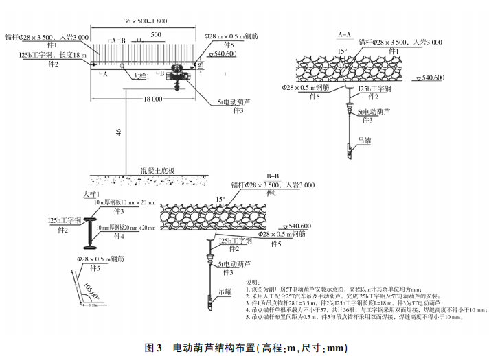 吊點錨桿施工:在通風(fēng)機(jī)房樁號CZO-122.00右6m至主廠房副廠房廠左12m段洞頂供高程540.600m位置布設(shè)一根125b工字鋼長度18m 。5t電動葫蘆通過125b