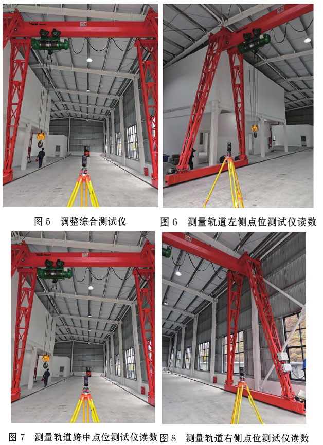 司,該設備于2023年5月19日校準,設備正常。面對主梁,放置綜合測試儀,調整水平(圖5)。將電動葫蘆運行至左側接近支腿處,露出軌道端部便于后續測量。