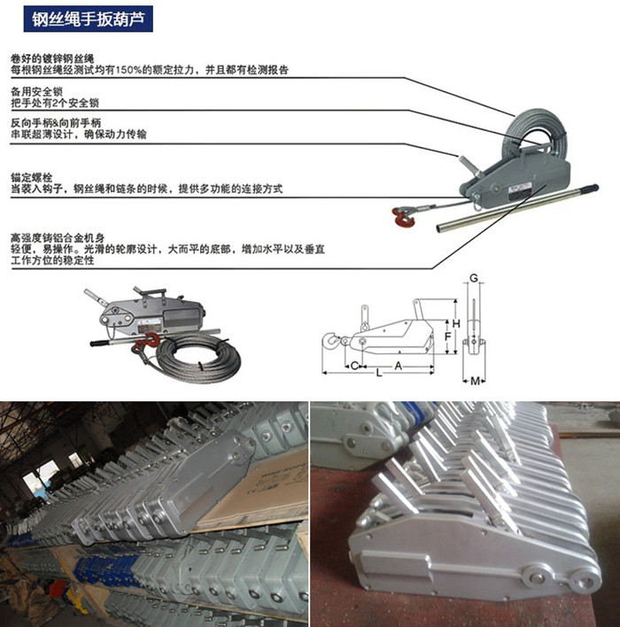 SM鋼絲繩手扳葫蘆機殼采用高強度優質鋁合金壓鑄而成,配套使用的鋼絲繩具有特別高的破斷拉力和耐磨性,根據客戶需要配置相適合的鋼絲繩長度。主要給個為800公斤、1600公斤、3200公斤。適用于工廠、礦山、建筑工地、碼頭、運輸等各種場合,是設備安裝、貨物起吊、物體固定、綁扎和牽引的理想工具,尤其是任意角度的牽引和在場地狹小,露天作業和無電源的情況下,更顯示其優越性。本產品嚴格按國家3包執行,產品質量由中國人民保險公司(PICC)承保,請放心使用。