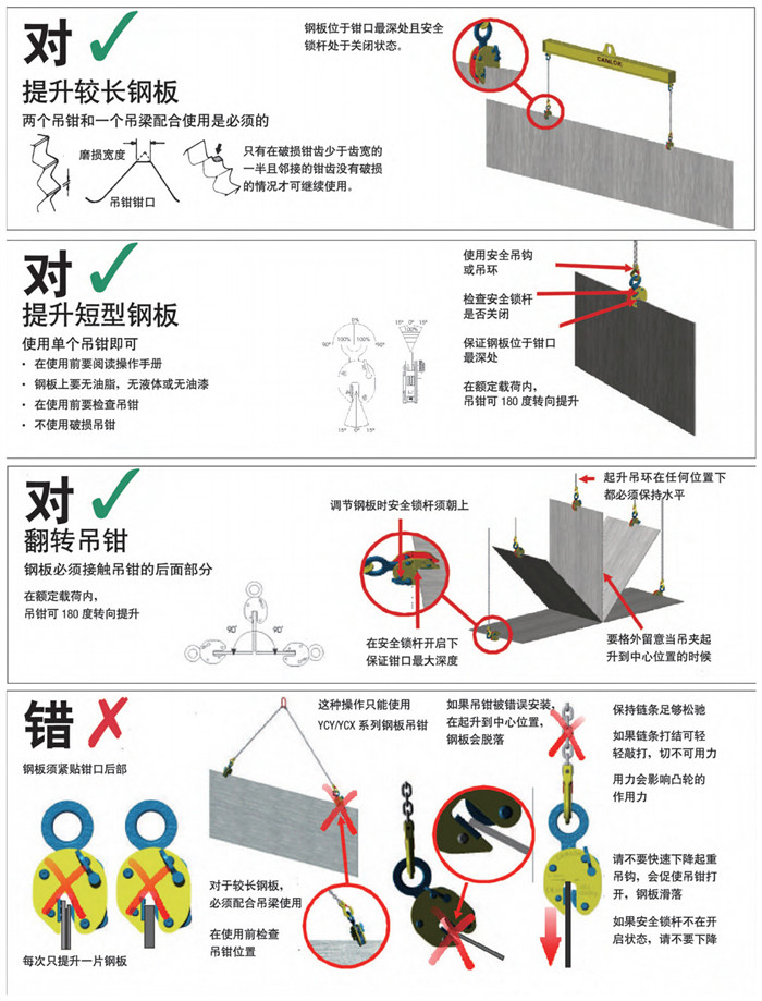 CDH型豎吊起重鉗適用于鋼板豎直吊裝,此種鋼板吊鉗采用首鋼低碳優(yōu)質(zhì)合金鋼制造,載荷范圍為0-10噸。它只能同時吊裝一塊鋼板,嚴(yán)禁層疊吊裝。吊鉗起 吊時必須將拉環(huán)手柄向上,以使彈簧拉緊,卸荷時拉環(huán)手柄向下,彈簧放松后簽字和鋼板才能分離,且吊裝過程中不得碰撞被吊物,嚴(yán)禁超載使用。帶彈簧鎖無作業(yè) 狀態(tài)下,鎖具自然加緊,吊上物體夾力成比例增強(qiáng)。本產(chǎn)品嚴(yán)格按國家3包執(zhí)行,產(chǎn)品質(zhì)量由中國人民保險公司(PICC)承保,請放心使用。