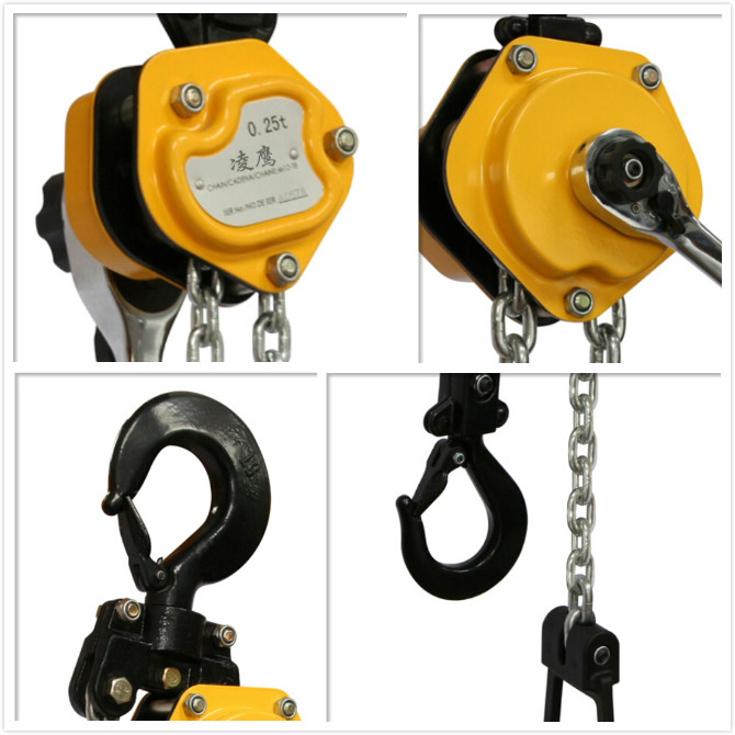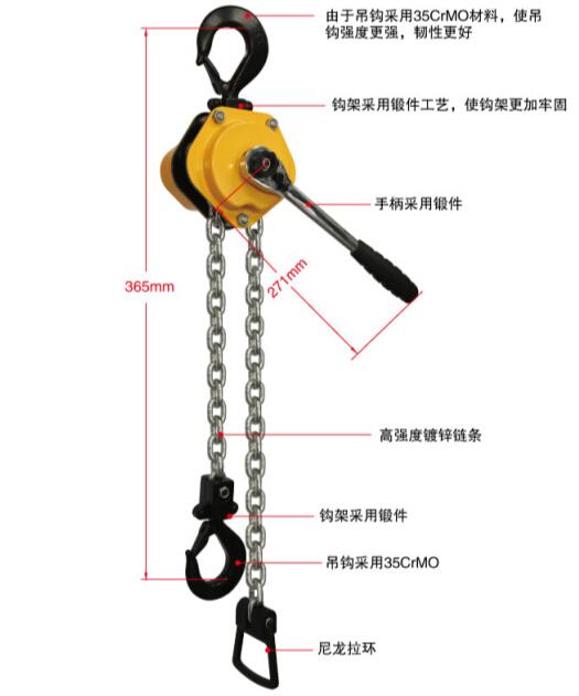 2、  吊鉤帶有牢固的安全鎖扣,可自由旋轉360度,吊鉤采用35CRMO材料,使吊鉤強度更強,韌性更好。